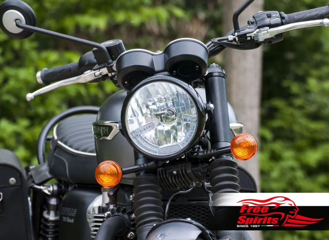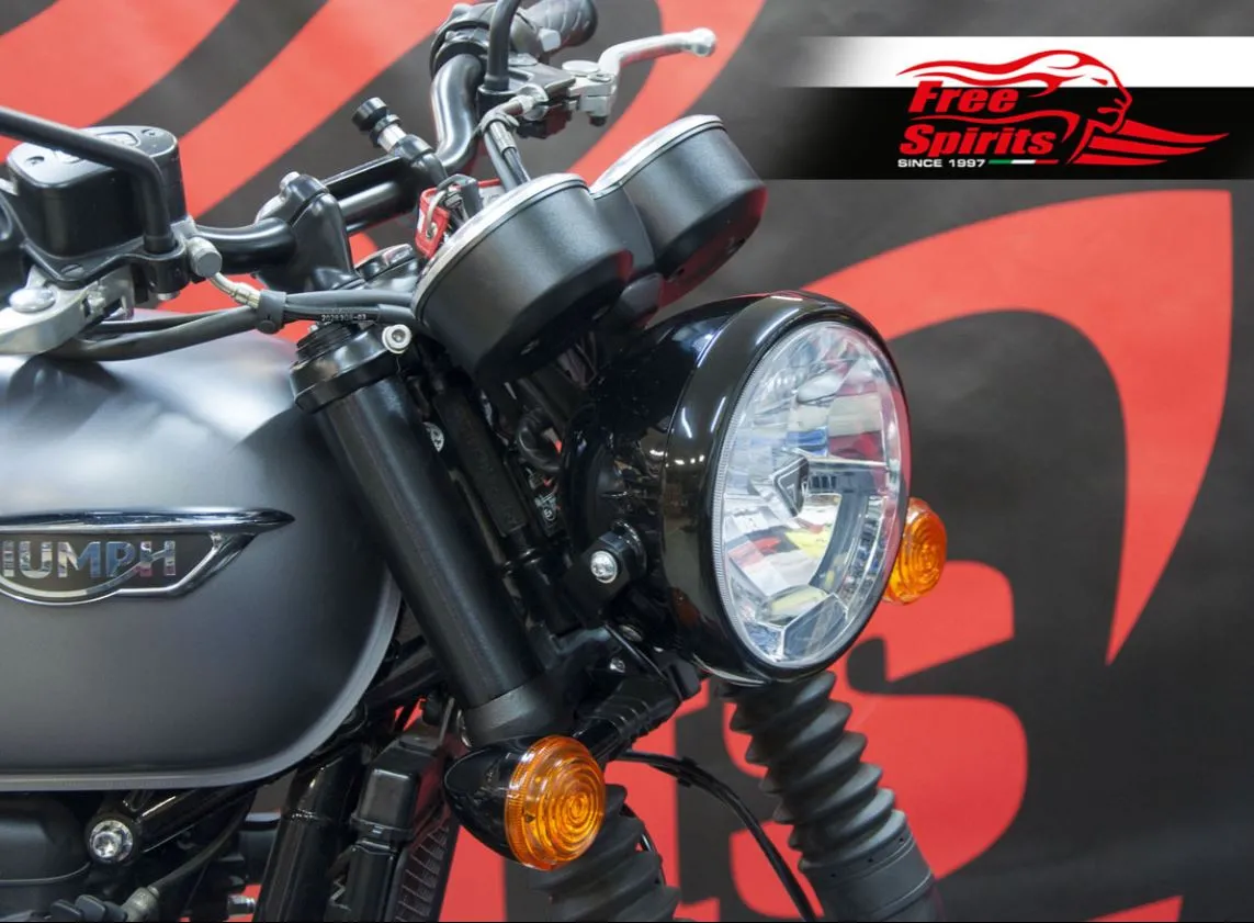 Headlight 20mm lower and 23mm further back for a more compact and captivating Thruxton-style aesthetic, with the advantage of using the original headlight and with the wiring that remains inside the original headlight without the need to hide them in any other way.