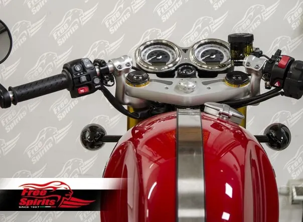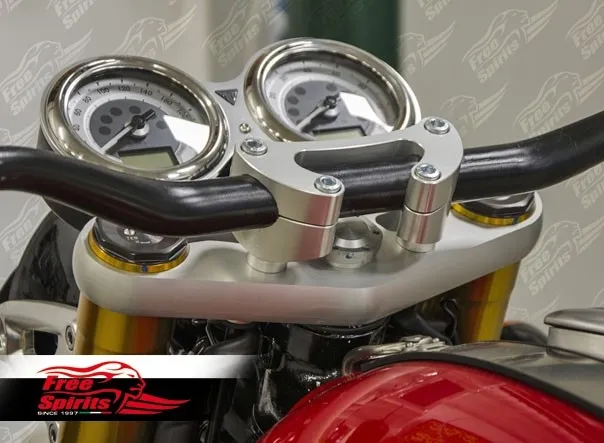 ×Straight triple trees which allows to lower front end of around 23mm. and rise clip on bar of the same amount.