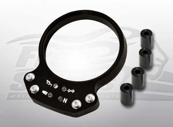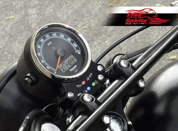 ×Free Spirits chose to use the original speedo, so they built a new billet bracket complete of wiring and 4 led (engine-red, neutral-green, high light-blue, indicator-green).