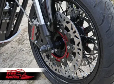 Hub comes with 25 mm wheel bearings, which is compatible with the “Triumph Speed-Triple” wheel axle or a smaller one. Axle spacers must be built to be adapted to the chosen fork.